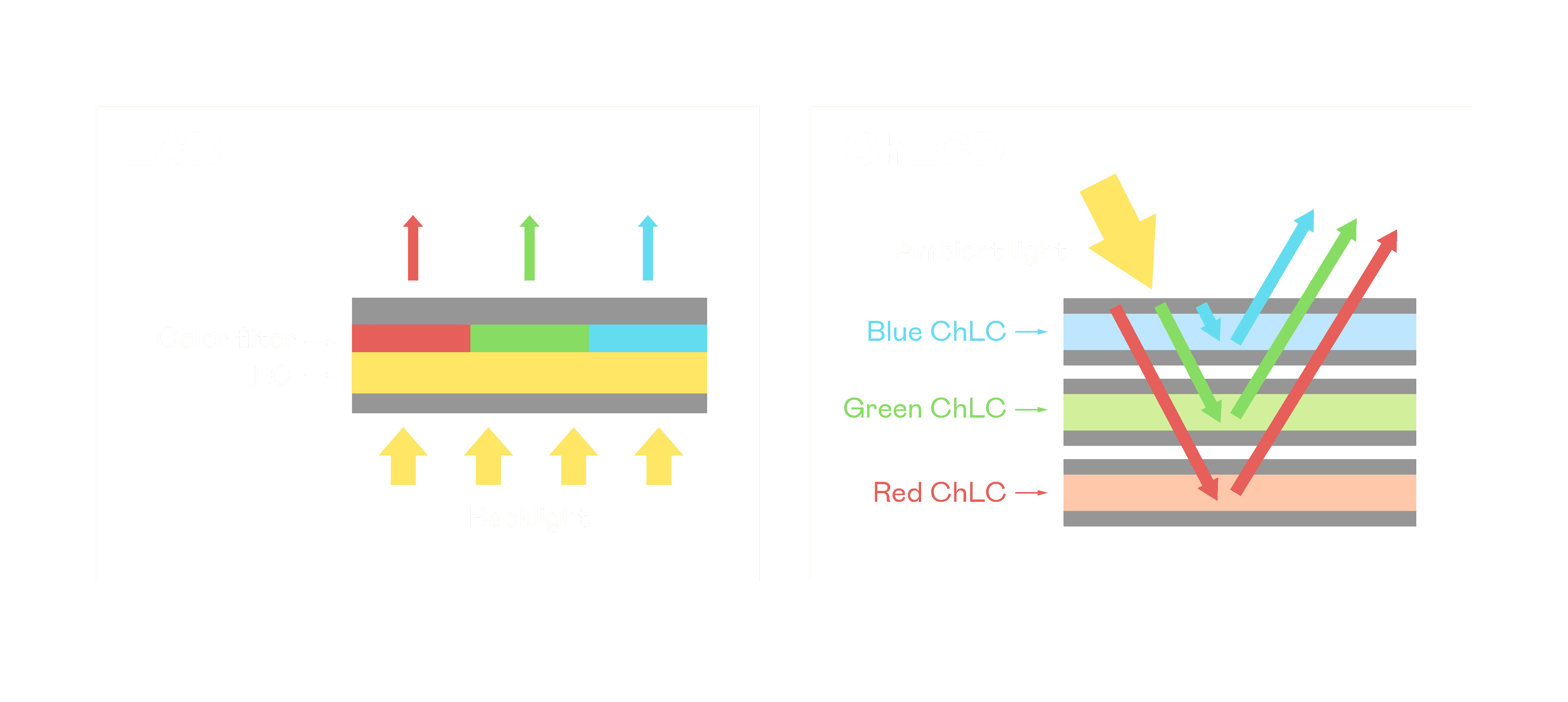 ChLCD 胆固醇液晶就如同纸张一样,,,透过反射环境光来显示影像,,,,因此长时间观看不易造成人眼视觉疲劳,,,可达到护眼效果。。。。当处于户外阳光下使用,,LCD 影像容易失真而不易观看,,但胆固醇液晶仍可维持较佳的影像品质。。。